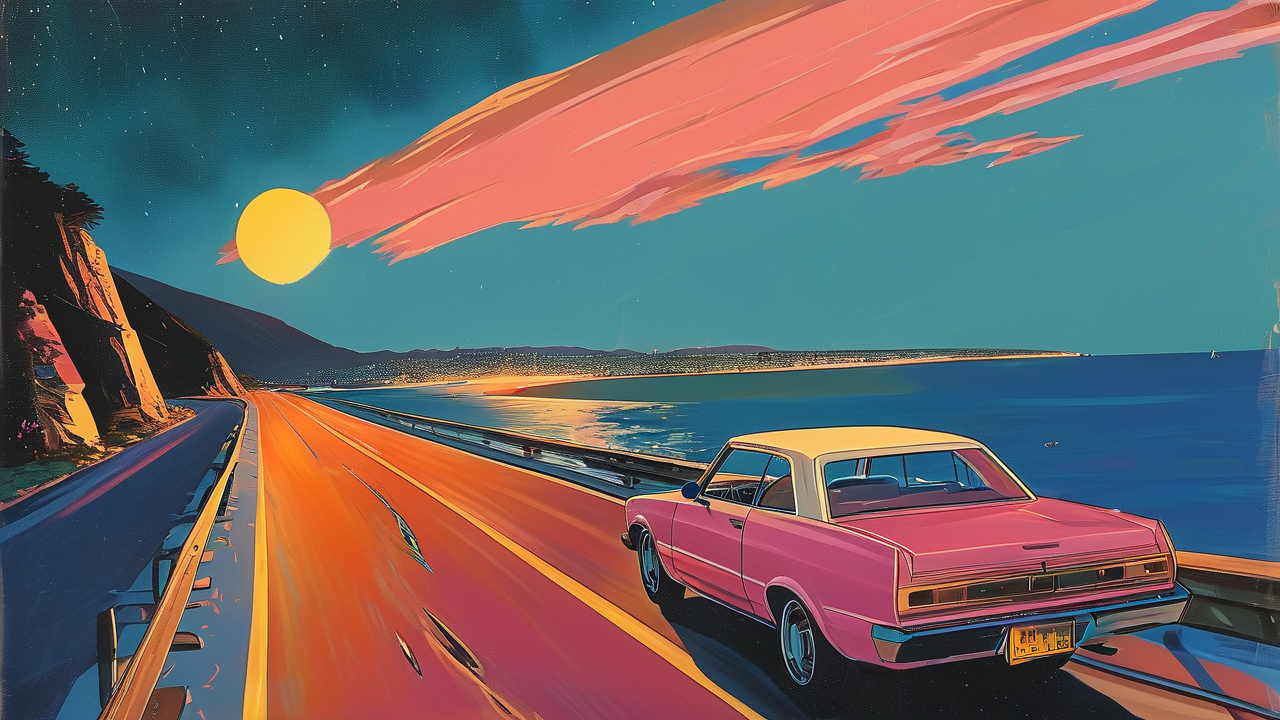 图像描述: 插图,落日飞车,汽车开在海边公路,水平构图,70s复古艺术,能看到远方的落日和城市,有星星,海岸线,citypop艺术风格,凯特·科洛维茨的风格,蓝粉色主调,插画完美体现,前卫艺术,拼贴艺术。