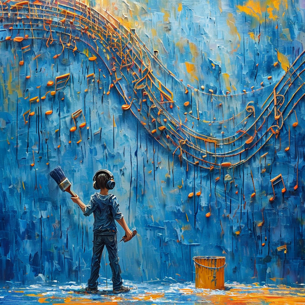 图像描述: 油画质感,大写意,画面居中构图的一抹尘埃组成细小密集的音符群,层层叠叠构成乐章,层次分明,梦幻,画面底线上一个的头戴耳机少男拿着油漆刷子在墙上涂上乐曲,旁边有一个油漆桶,动态模糊,艺术作品,极简,大面积留白,克莱因蓝色细腻颗粒纹理纸质背景。