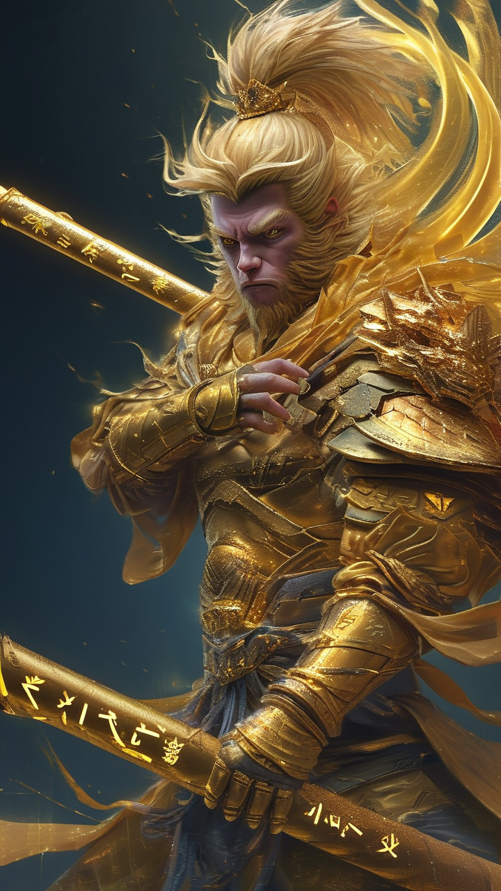 图像描述: 图片风格为赛博,图片风格为赛博,赛博朋克风格,细节刻画细腻,极致渲染,超高清画质,概念艺术。,图片风格为赛博,赛博朋克风格,细节刻画细腻,极致渲染,超高清画质,概念艺术。,图片风格为赛博,赛博朋克风格,细节刻画细腻,极致渲染,超高清画质,概念艺术。,图片风格为赛博,赛博朋克风格,细节刻画细腻,极致渲染,超高清画质,概念艺术。,图片风格为赛博,赛博朋克风格,细节刻画细腻,极致渲染,超高清画质,概念艺术。,运用CG厚涂的艺术手法,画面中展示了一位身着金色铠甲的孙悟空形象,铠甲的每一处细节都刻画得极为精细,金色的光泽流转其中。孙悟空双手紧握一根金色金箍棒,金箍棒上刻有神秘的符文,散发着强大的力量。孙悟空的身后,浮现出一个巨大的金色武魂真身,武魂真身的轮廓与孙悟空相似,却又更加宏伟壮观,周身环绕着金色的光芒,仿佛在彰显着其无上的威严。整个画面构图紧凑,以金色为主色调,营造出一种神圣而又强大的氛围。头带金冠是孙悟空。