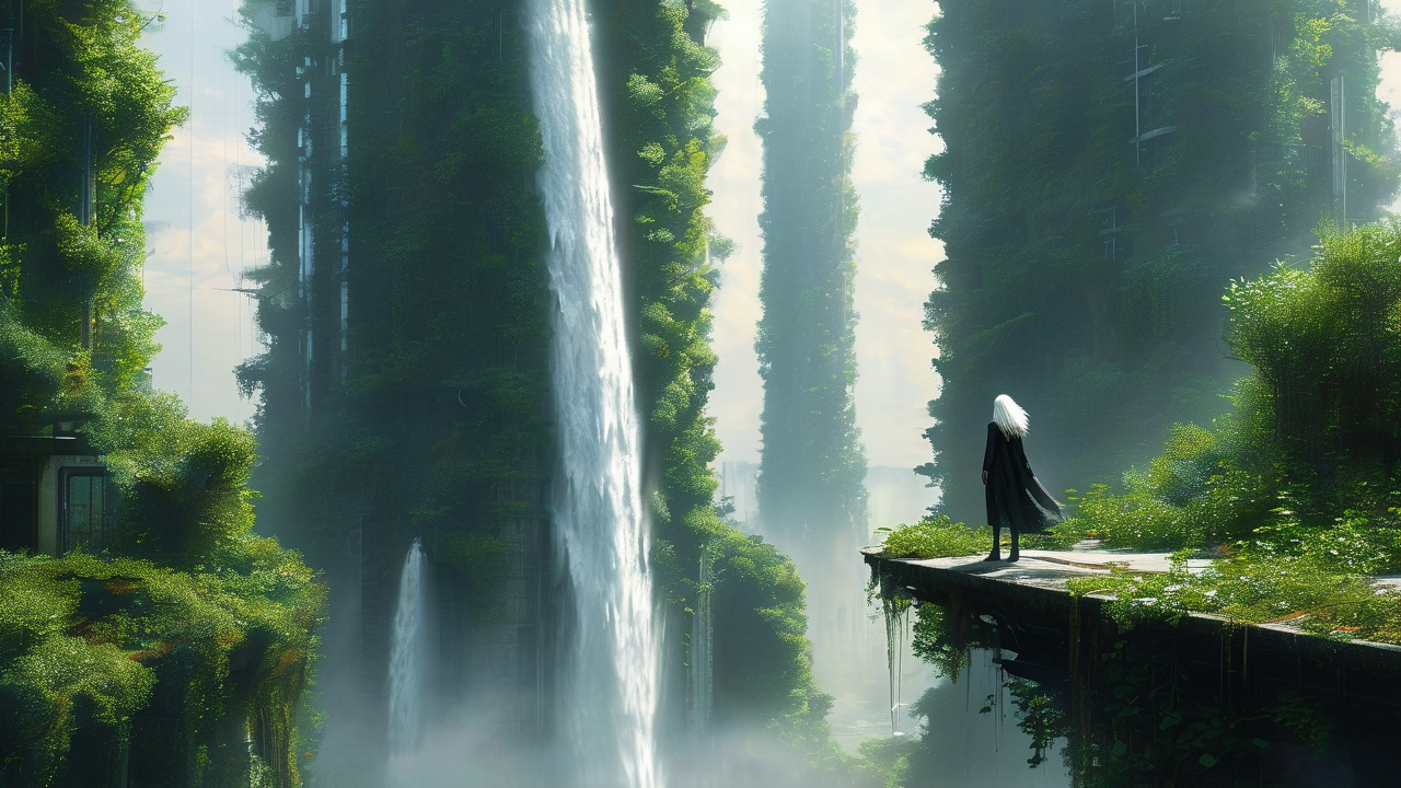 图像描述: 在一个未来或末世风格的场景中,一座高耸的摩天大楼被植物覆盖,屋顶和部分外墙长满绿色藤蔓与树木,呈现出被自然重新占领的状态。大楼顶部倾泻出一条巨大的瀑布,水流从高处飞泻而下,形成梦幻般的视觉效果。画面右侧,一位身穿深色服装、拥有长白发的孤独人物站在一条狭窄的高架平台上,凝视着远方的瀑布与建筑,背影静默而沉思。整个场景笼罩在薄雾之中,光线从雾中穿透,营造出朦胧、神秘而富有戏剧张力的氛围。画面融合了城市废墟与自然奇观,象征时间流逝、孤独与生命的延续。