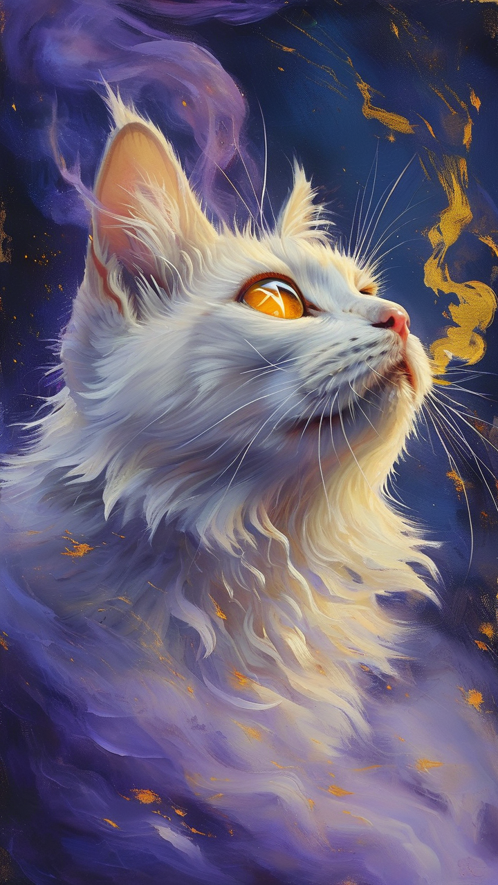 图像描述: 故事背景是中元节,主角是一只白猫,眼睛里有星星,张扬,由紫色的烟雾带着金色的光芒变成,东方神话中的玄幻世界,构图饱满,绘本风格,油画棒涂鸦,手绘风格,特写,笔触明显,