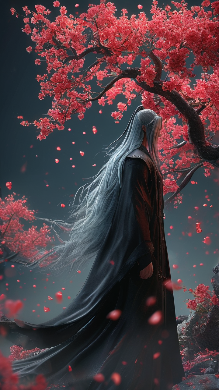 图像描述: 图片风格为CG 厚涂,CG 厚涂,游戏CG ,丰富的色彩层次,质感细腻,真实光影,精致的细节。,画面采用极具质感的CG厚涂和游戏CG风格,色彩层次丰富,质感细腻,细节精致,还结合了三维古风搭配移轴摄影的风格,运用国风光影营造独特氛围,呈现出高清8K且HDR效果显著的画面,由3D渲染与虚拟引擎渲染完成,立体感十足。在暗黑魔幻且被月色笼罩的暗夜场景中,一棵血色桃花树下,一位银灰色长发、飘发超长且柔顺的古风魔君侧身站立,他身披黑色披风,制作工艺顶级,造型超级精致复杂又唯美。整个画面以红色系为主题,血色桃花花瓣飘落,以15度仰视角展现,凸显出魔君的神秘与霸气。