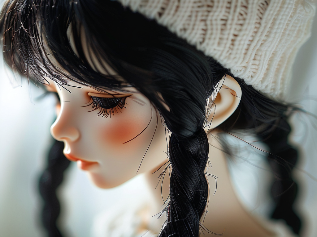 提示词: 运用电影写真风格拍摄一张BJD娃娃的半身像,画面着重于娃娃的脸部特写,身体协调自然。娃娃黑色的头发是八字分叉长刘海样式,麻花辫盘发搭配白色发箍,显得俏皮又优雅。白色的休闲衣和白色短裤质感满满,娃娃冷白皮的肌肤在侧光的照射下,产生柔和的阴影,增强了立体感。背景虚化处理,突出主体娃娃,整体画面富有故事感和艺术氛围。