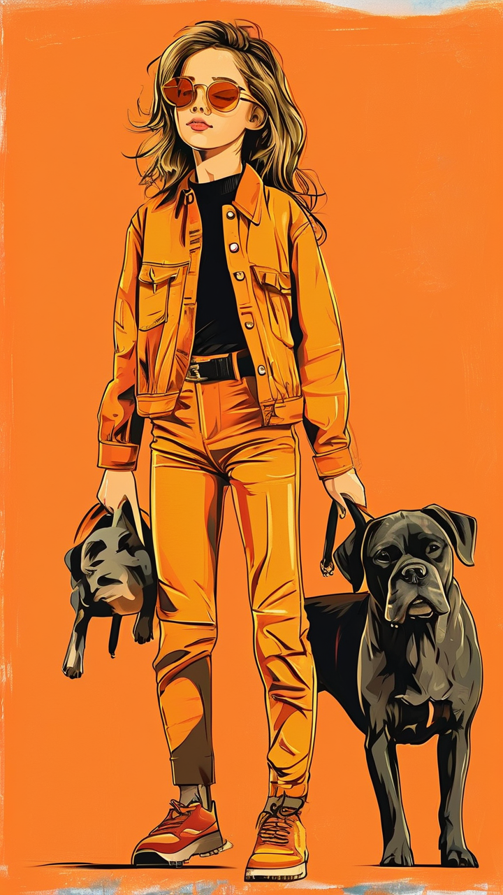 提示词: 扁平插画,一个可爱的卡通女孩穿着时尚的衣服戴着墨镜抱着狗,全身,橙色背景,以Keith Haring的风格涂鸦,清晰的插图,大胆的线条和纯色,简单的细节,极简主义。