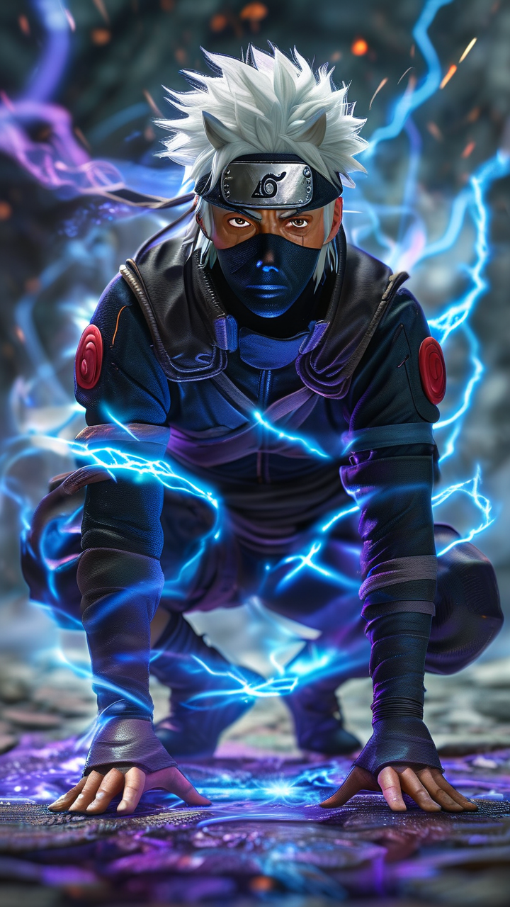 提示词: 真人写实派火影卡卡西,白发,护额,结印,手掌心撑地地上呈现出全屏结界咒术印,空间扭曲,黑紫色雷电缠绕全身,超广角低角度仰拍,PBR材质皮肤清晰可见,动态模糊的瞬身轨迹,蓝色查克拉能量包裹覆盖全身,景深,动态残影,多重。