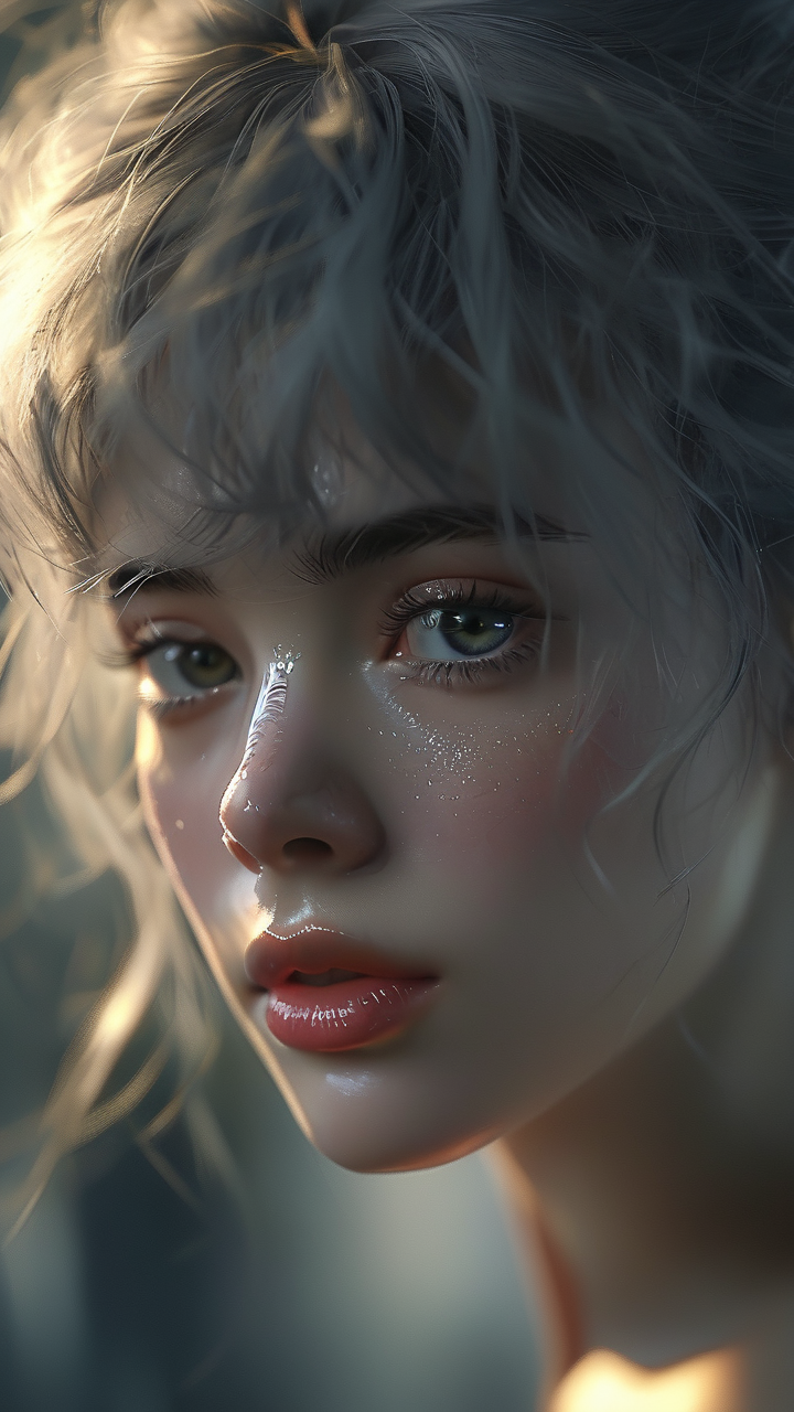 提示词: 真实照片质感, 薇尔莉特特写,灰色发丝蓬松凌乱透冷光,氛围梦幻,光影柔和,调皮青涩可爱,反光水润玻璃感晕染唇釉,魅惑又天真凝视镜头,电影级冷暖光对冲,明暗高对比,超精3D肌肤粒子(细腻肌肤/绒毛),柔焦虚化背景,胶片颗粒质感。画面发光特效,焦点锁定眼部折射光斑。近景拍摄