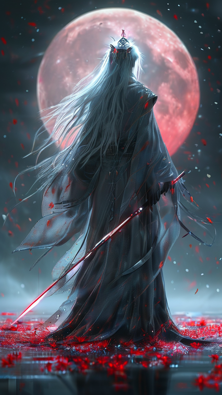 提示词: 写实风格,写真风格,真人皮肤,超高分辨率,全身男,悬浮,覆盖天地造型独特夸张繁杂华丽精致光环,银色修士袍笼阳光,地面荧光反光血红色花海,巨大居中血色满月,银色长发晶莹带光,长柄红色能量多形态光能武器镰刀,战斗姿态,冷酷漠视,面部与身体带阴影,红色速度流光,动态模糊,夜晚,广角景深,低亮度,幽冷暗调,ue5渲染,强对比,深红与黑对比,红光弥散,电影级特效,大风中衣摆发丝动态,高挑修长,日系风格,逆光伦勃朗光,花瓣飞舞,周身代码粒子罗盘(含太极图),黑色哑光背景,科技感神秘感,灰白色珠光皮肤如水银流淌,星河旋舞,古风神明头饰,极繁神圣铠甲,身后巨型立体轮环旋转,末世能量粒子流(异类人形态生物变种)外骨骼妖精化,发型随机,奇异造型,赛博朋克风格,未来科技感,超级纳米核心研发,无限细节,8K分辨率,OC渲染,光线反射追踪,虚幻五引擎,视觉冲击,超震撼写实,抽象,HDR,UE5渲染,概念图设计,顶光照射,随机场景,随机BUFF元素特效,大师杰作,颗粒感,3D效果,锐化,CG插画,完美构图,黄金比例,身材曲线,电影质感,超精细,32K景深,数字化艺术,3A大作,超立体感,C4D科幻主题。(PNG)UE5+Octane 渲染,饱和度拉满,晕影效果,清晰度拉满,随机造型POSE,随机一个武器,随机首饰。