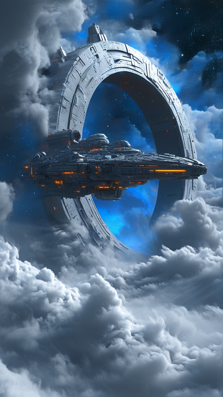 提示词: 3D,3维,宇宙星空。云雾翻腾。星球。灰蓝色系。一艘繁琐复杂宏伟壮大的艘宇宙飞船穿越时空之门。高光。光体。巨大宏伟的时空之门,圆形发光。科技感。
