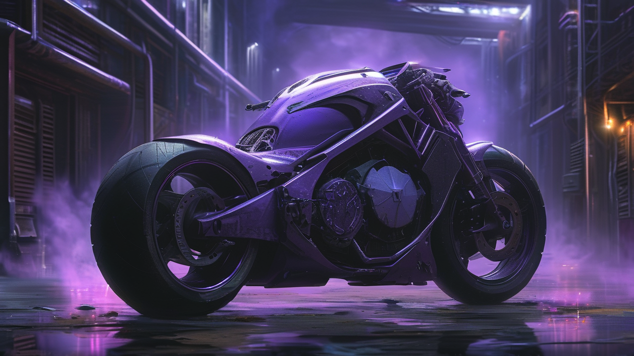 提示词: 图片风格为赛博,赛博朋克风格,细节刻画细腻,极致渲染,超高清画质,概念艺术。,赛博朋克风格,用概念艺术描绘一辆紫色的摩托车,带有雷霆和魔焰质感的特效,停在废弃工厂的中央,工厂里机器闪烁着微弱的灯光,周围弥漫着紫色的烟雾,侧光勾勒出摩托车的轮廓,采用特写视角,突出摩托车的细节,整体色调偏暗,以紫色和黑色为主。