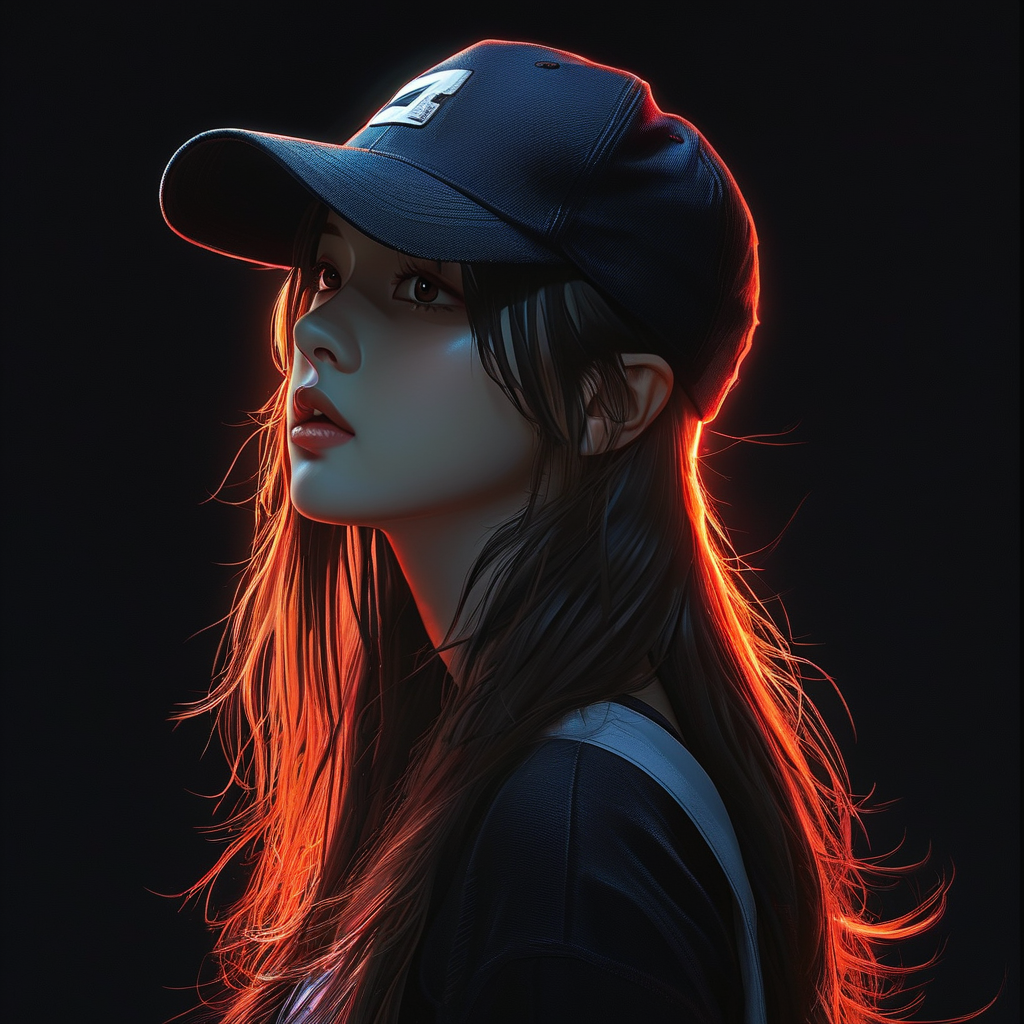 提示词: 以艺术与神秘兼具的风格打造画面,纯黑背景上,运用侧面45度角构图来展示戴棒球帽的直长发女生春野樱的剪影轮廓,姿态安静。侧前方的光线让春野樱微微发光,红色调的剪影在黑色背景下形成高对比度,画质细腻,在鲜明的明暗对比中塑造出立体的轮廓。