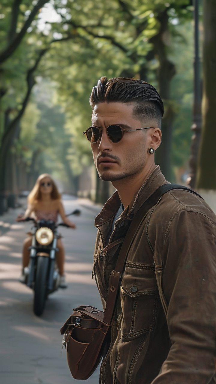 提示词: 一名三十岁的男人,留着美式前刺的发型,西方人的五官,穿着有气质,斜挎包,戴着墨镜,走在一条林荫大道上,后面有一位年轻的美女骑着一辆非常酷的摩托车过来,生成一条20秒左右的视频,格式9:16